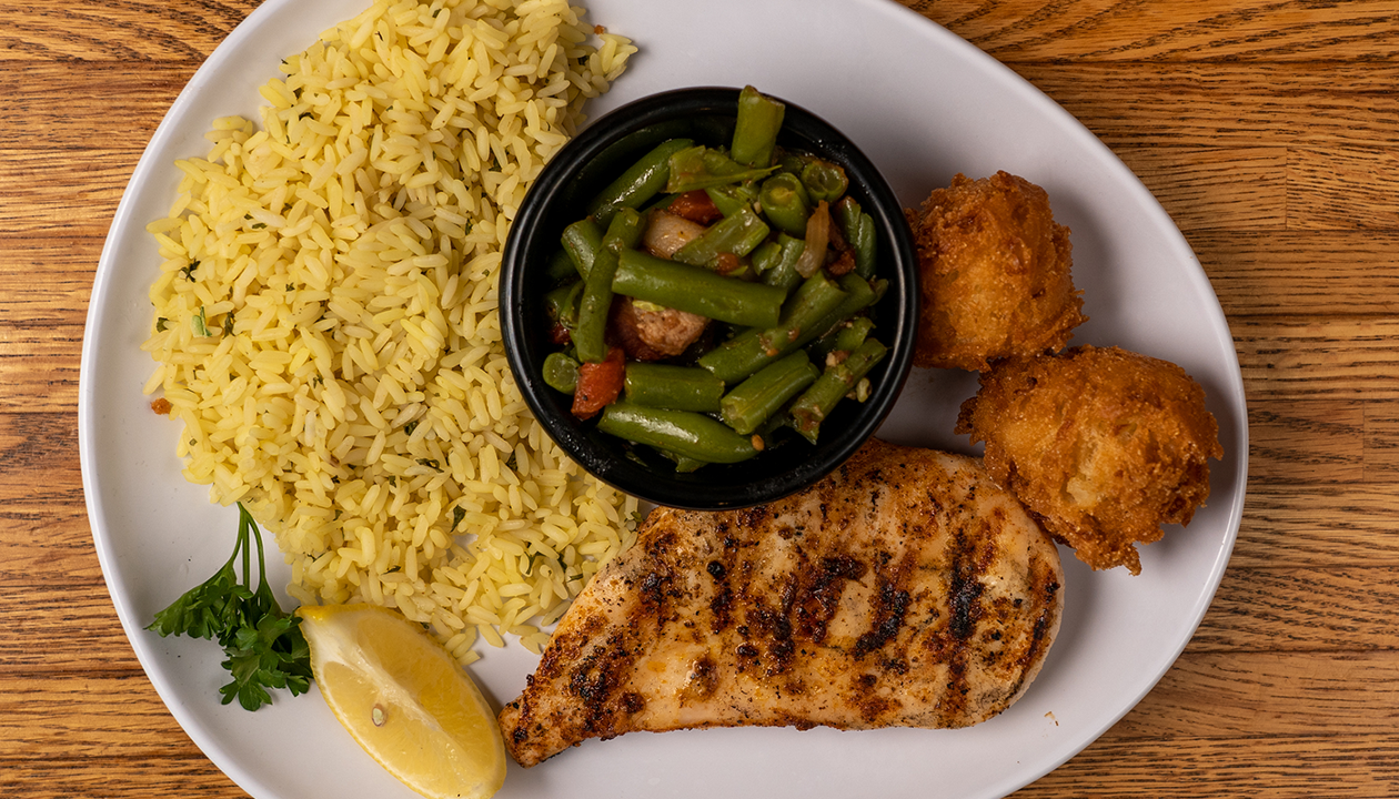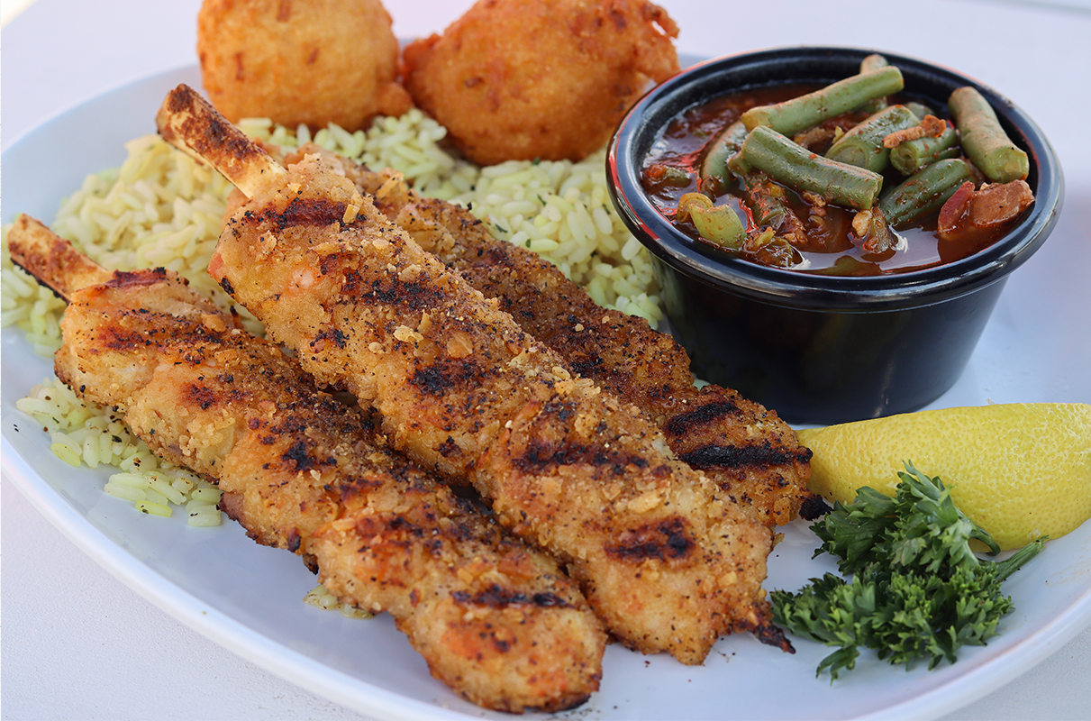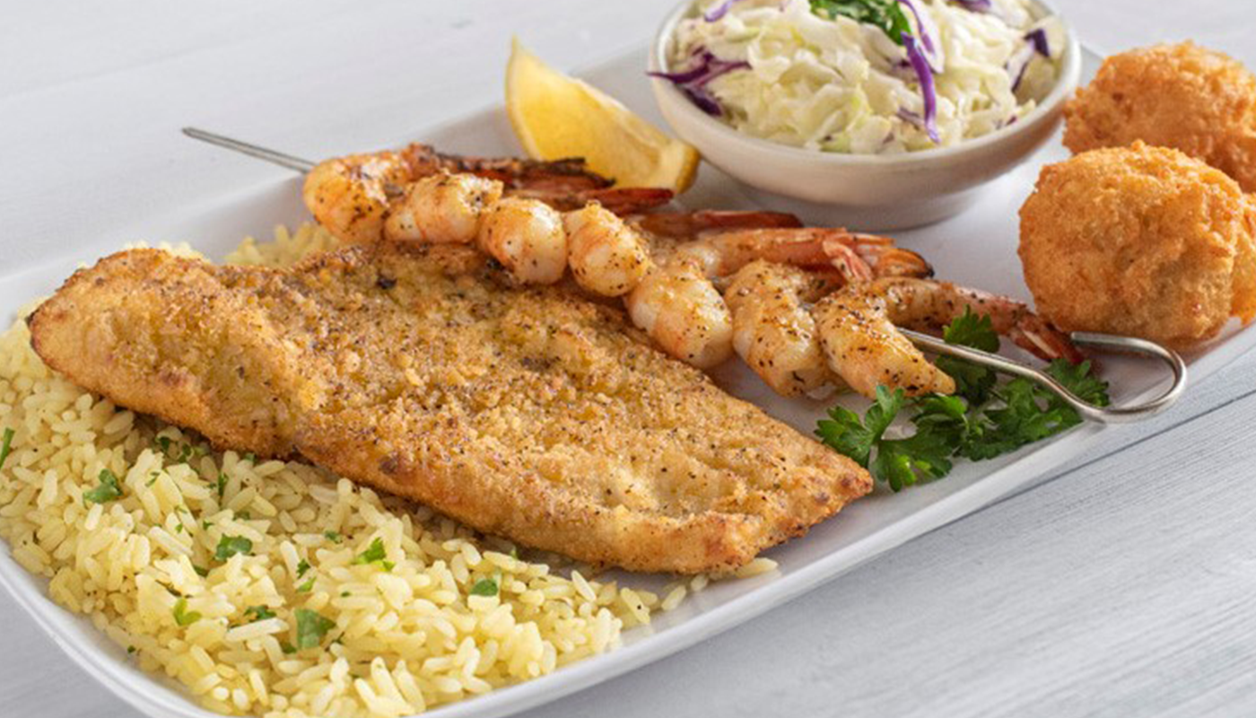 60 years of tradition on a plate! Enjoy a small beef kabob, char-broiled shrimp, a lemon pepper fish filet, a diablo cake, 2 fried colossal shrimp, a cup of shrimp gumbo and 2 sides.