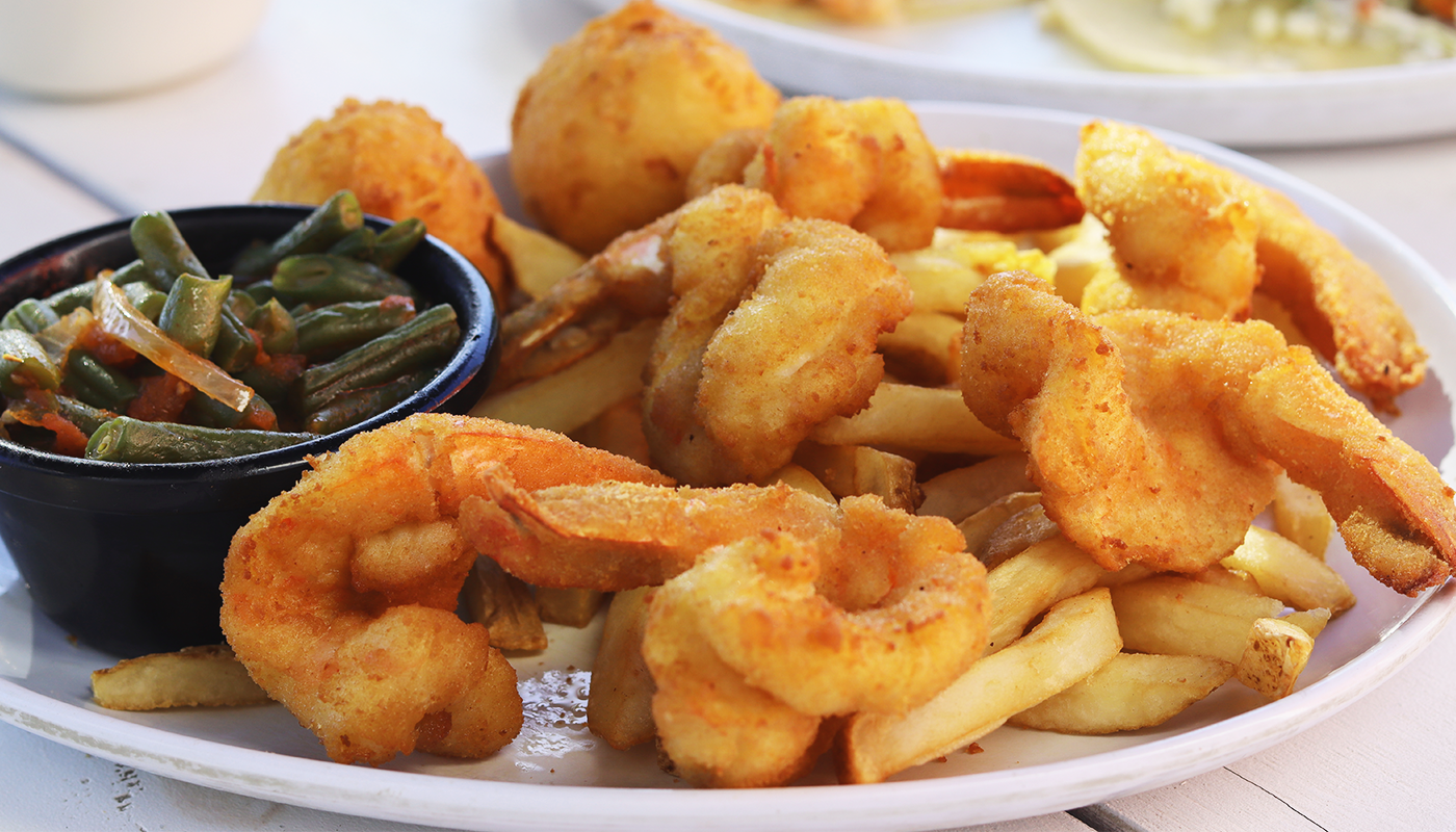 Six wild-caught fried shrimp, two stuffed shrimp and one fried whitefish filet.