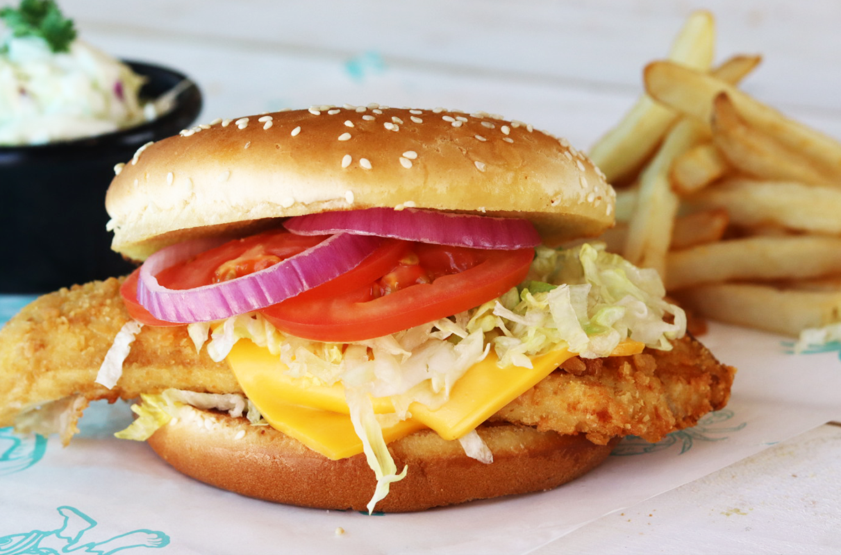 Hand breaded, fried fish filet with lettuce, tomato, cheese and onions on a toasted sesame bun. Served with French fries and coleslaw.