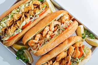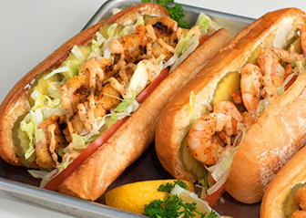 A heaping portion of wild-caught grilled shrimp on a soft Po' Boy roll with lettuce, tomato, pickles and fresh remoulade sauce.