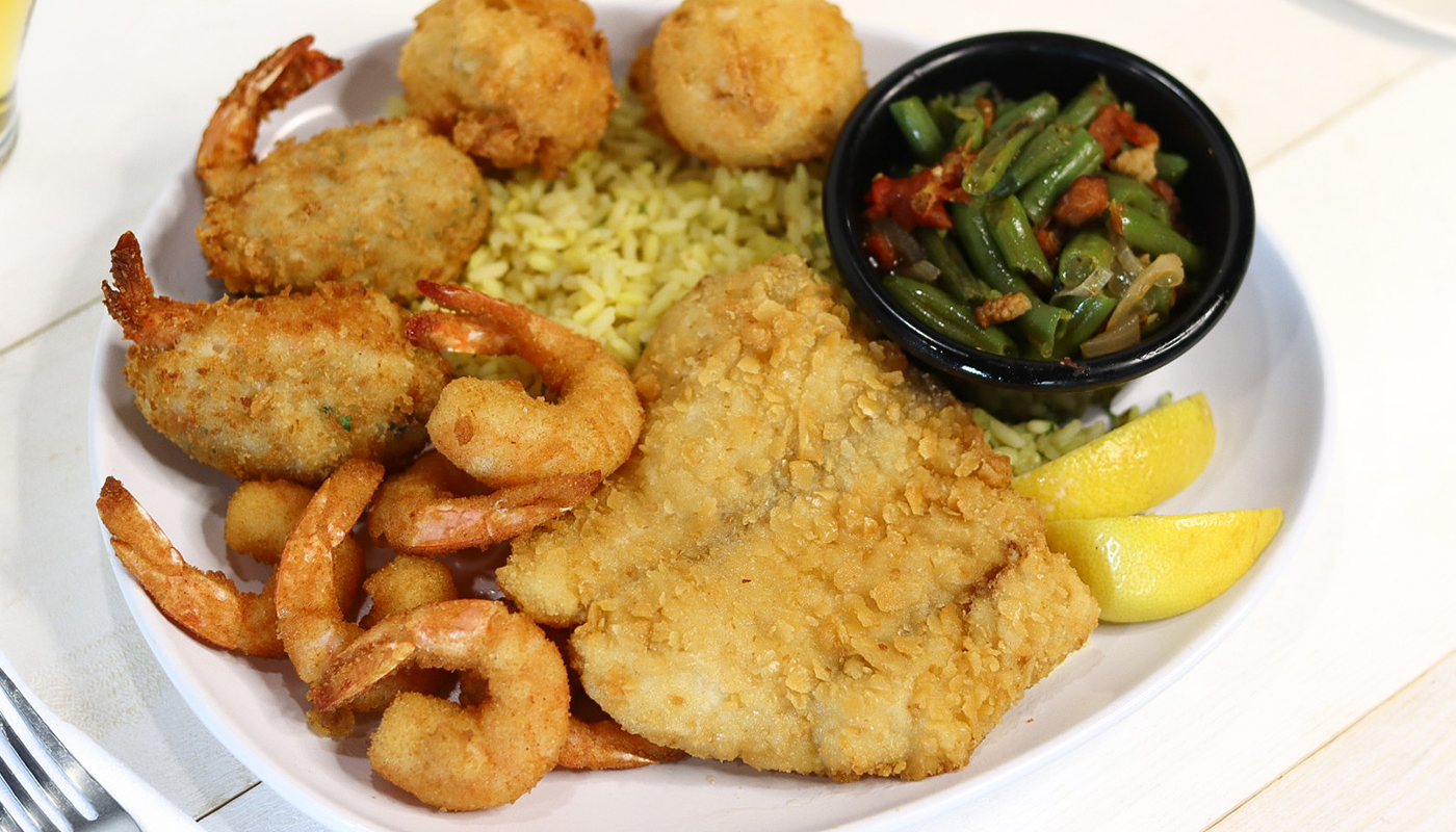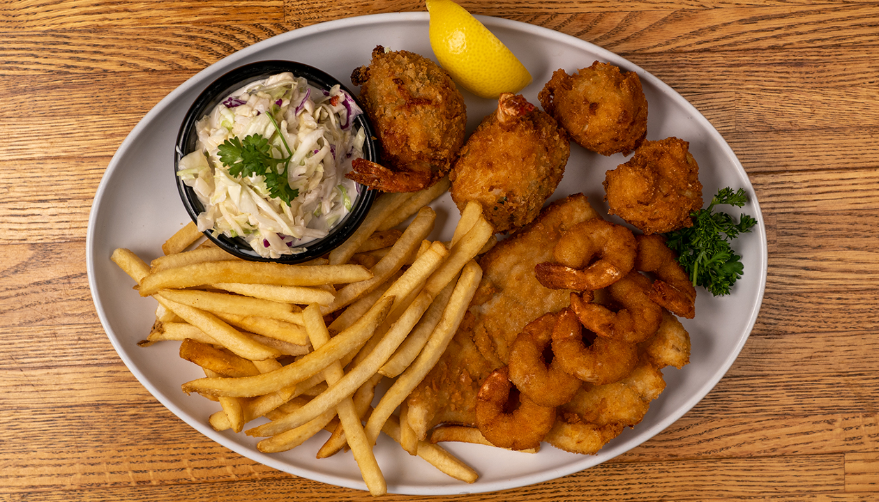 Two fried colossal shrimp, two stuffed shrimp, one hand-breaded whitefish filet and one catfish filet (sub. two fried oysters, or add for $1).