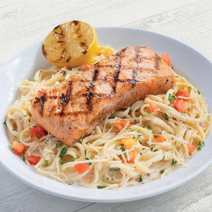 Linguine with a creamy tuscan butter sauce with tomatoes, garlic and shredded parmesan cheese topped with grilled Salmon.