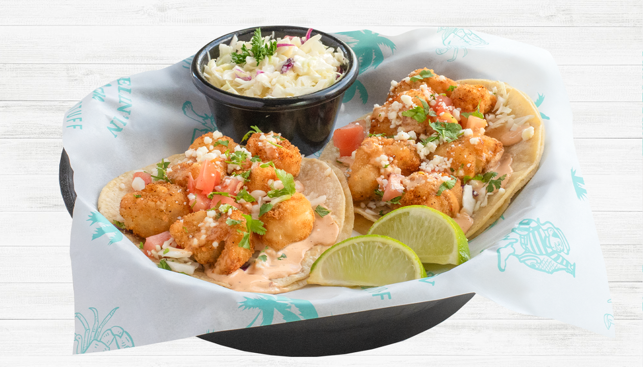 Hand breaded, fried whitefish nuggets wrapped in double layer corn tortillas with pico, cilantro and limes. 2 tacos served with choice of one side.
