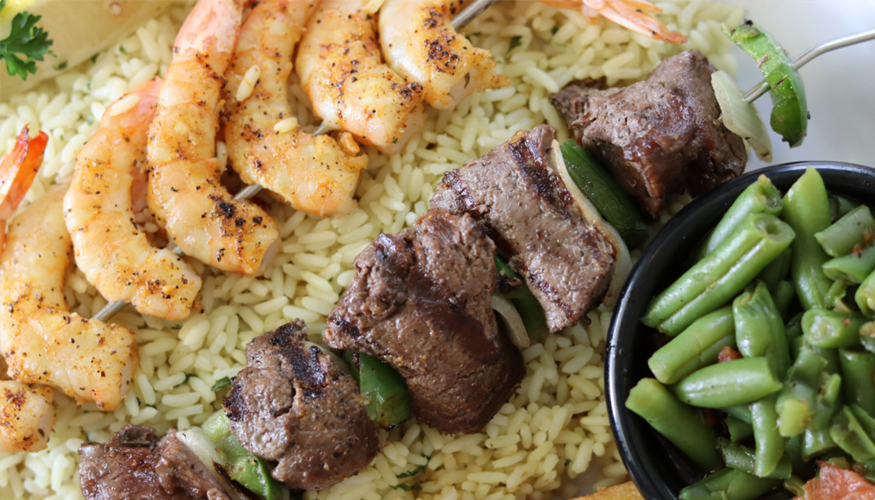 Marinated Black Angus sirloin kabob with grilled green peppers and onions and a skewer of Grilled Shrimp