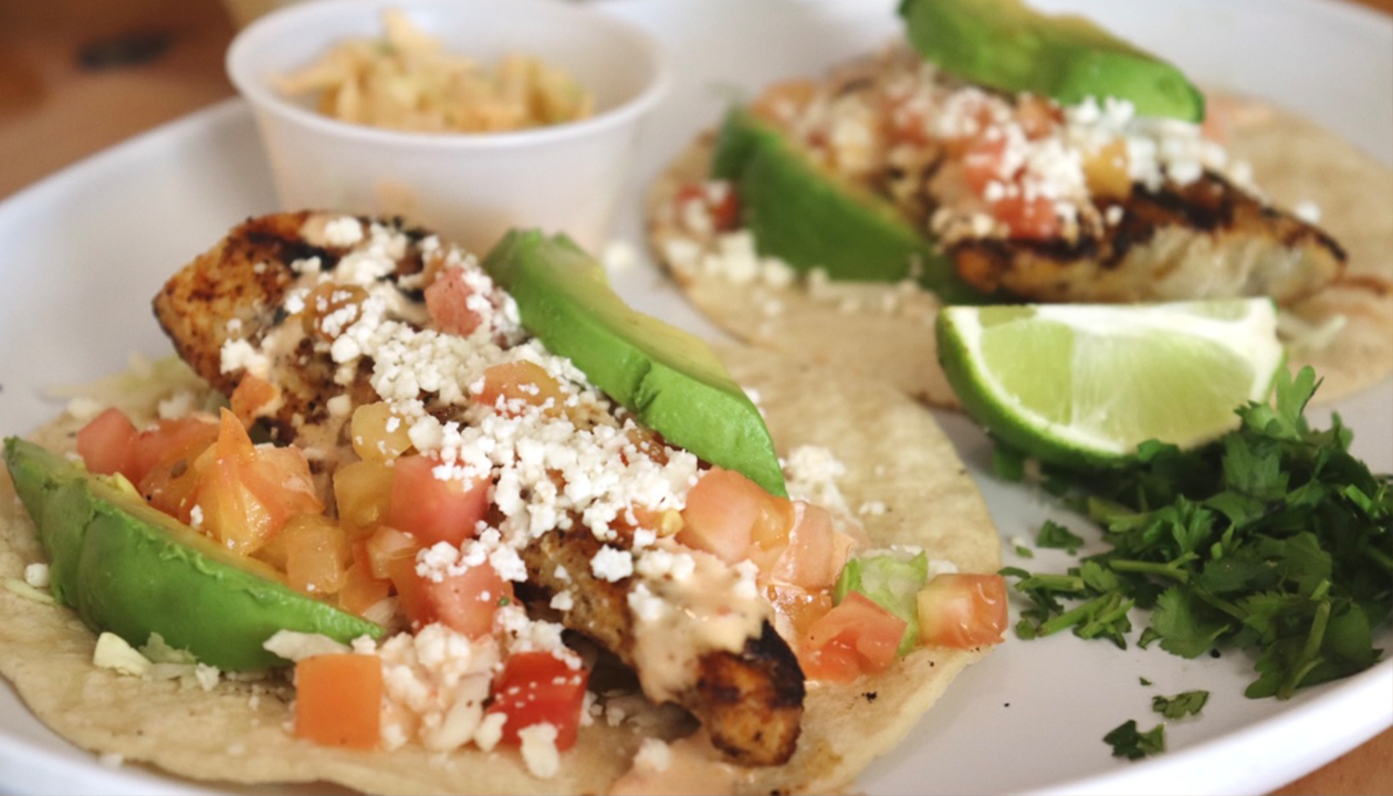 Two open faced tacos loaded with grilled Mahi Mahi, mixed cabbage, diced tomato, diced avocado, crumbled queso fresco and a drizzle of chipotle ranch on lightly grilled corn tortillas. Garnished with cilantro, limes and a sample size coleslaw.