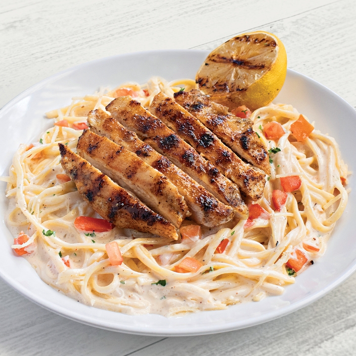Linguine with a creamy tuscan butter sauce with tomatoes, garlic and shredded parmesan cheese topped with grilled chicken.
